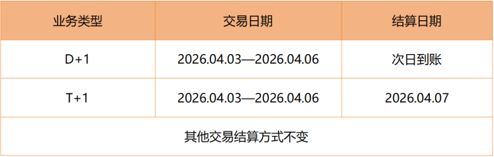 4006000578根据《国务院办公厅关于2026年部分节假日安排的通知》,2026年“清明节”放假时间为2026年04月04日 - 2026年04月06日,共3天;04月07日(星期二)上班。关于2026年“清明”期间的资金结算相关事项安排如下: